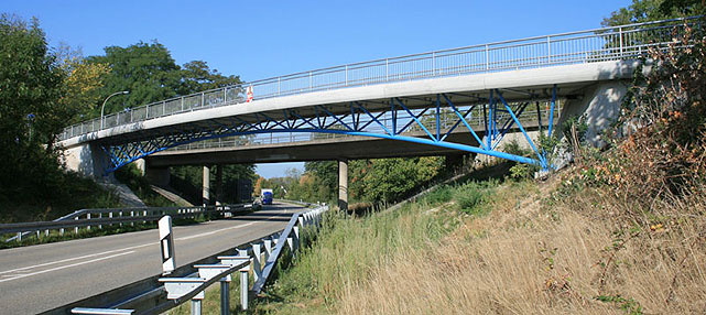 - Schiefwinklige Einfeldbrücke aus Dreigurt- Raumfachwerk. Untergurt und Diagonalen als Stahlhohlprofile, Obergurt als Stahlbetonplatte (Halbfertigteilplatten mit Ortbetonergänzung).