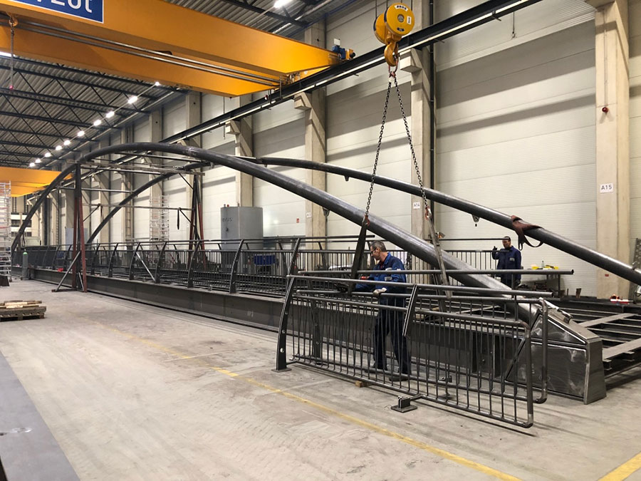 Stabbogenbrücke mit angehängter Fahrbahnplatte und Belag aus GFK-Planken