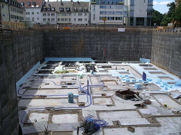 Die Gründung erfolgt über eine elastisch gebettete Bodenplatte mit darunterliegenden und von der Tragstruktur entkoppelten Geothermiebohrungen.